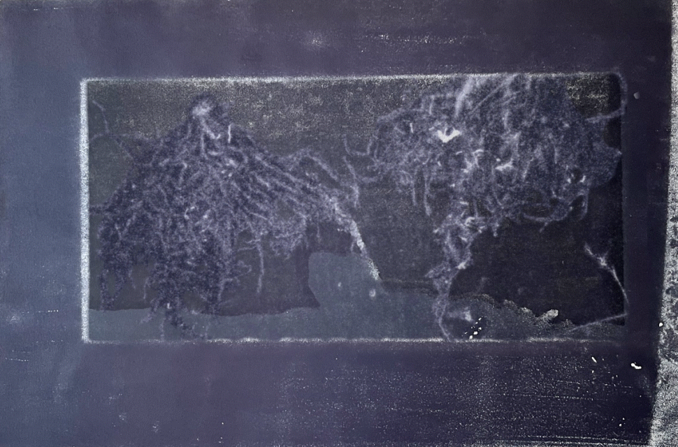 Setting the plant fragment and first impression aside, and pressing the same pad onto a clean piece of paper produces a second image resembling a microphotograph or rubbing taken from a low relief.